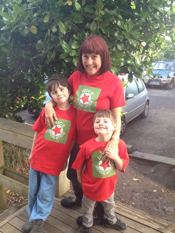 I brought some second hand juicers borrowed a trestle table and set up at the Waiheke market. I planted gardens, gave away seeds and got people to bring me their local organic greens to trade for juice and raw food. I did a Winz business course and got a grant to buy a juice trailer. I designed a logo to embrace all of these ideas and got my kids to wear the tshirt.